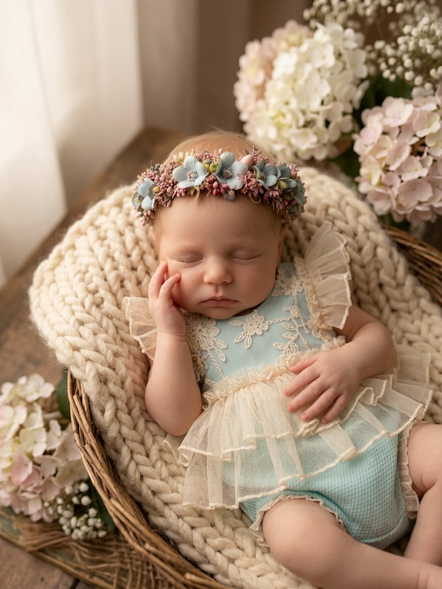 A dreamy choice for her first portraits. The Aquamarine Romper features an exquisite cream embroidered lace top accented with delicate tulle ruffles on the waist and sleeves. Designed with a soft, stretchy aquamarine fabric for the bottom, it ensures a comfortable, flawless fit for every photography pose.