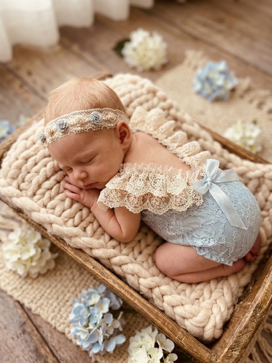 Soft and stretch headband, made with dainty lace, mini rose, Swarovski crystals and pearls.