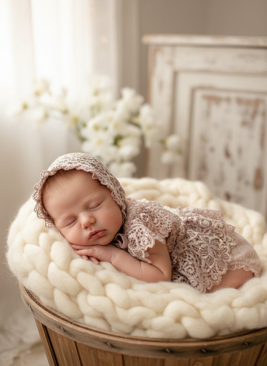 The Melody Romper is a dream in dusty rose, featuring exquisite cream floral lace appliqués on the chest and delicate ruffles. With its soft, textured fabric and comfortable fit, it is the perfect choice for first birthday celebrations, cake smash sessions, or spring portraits.
