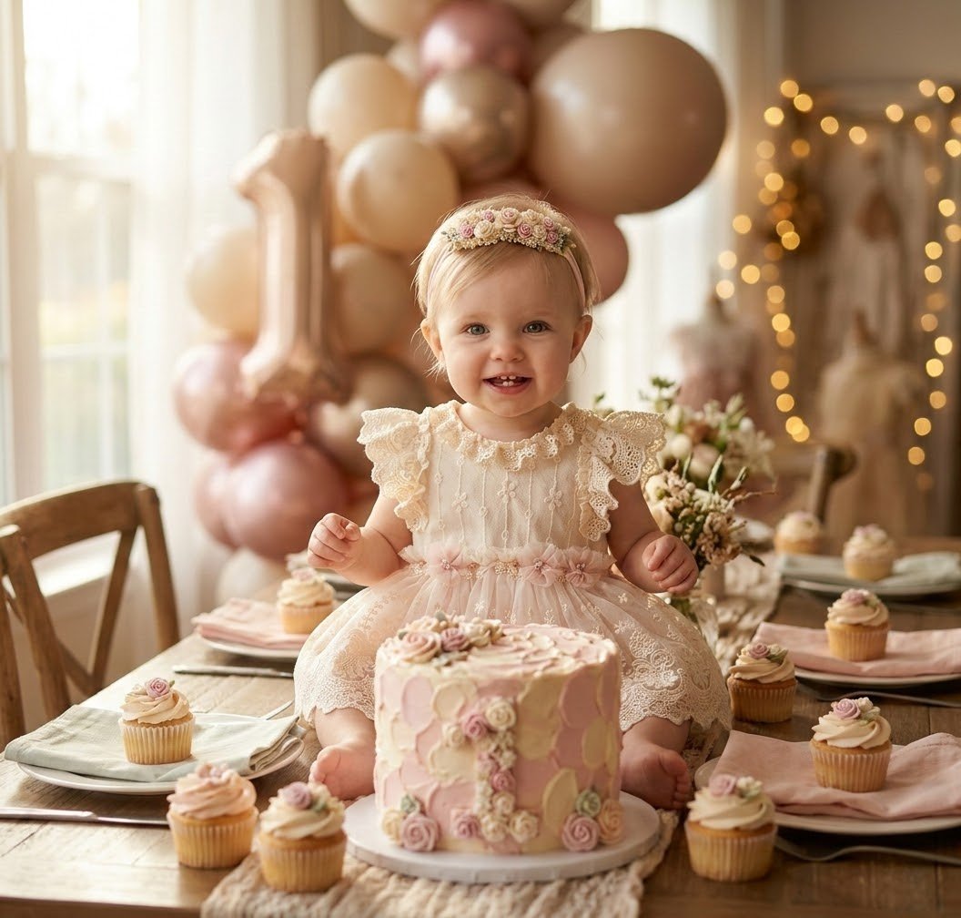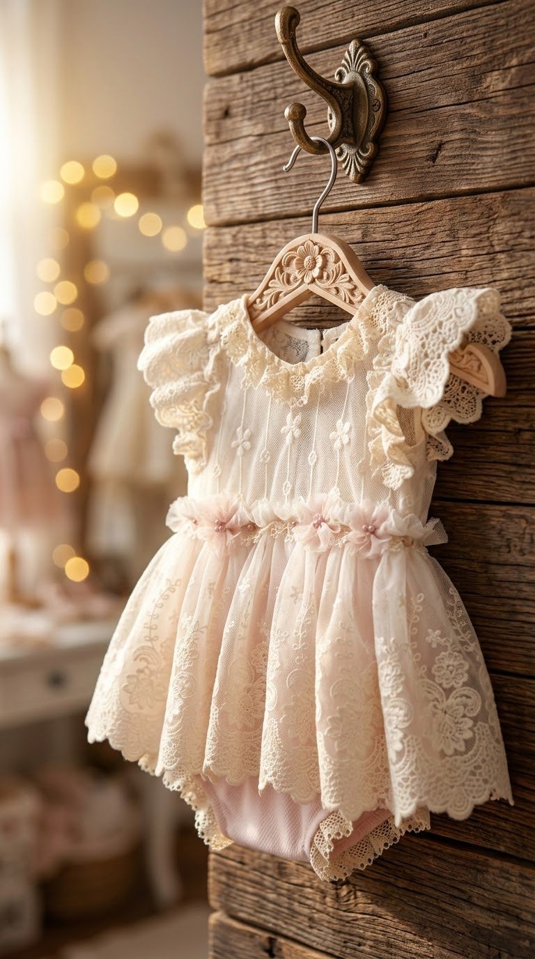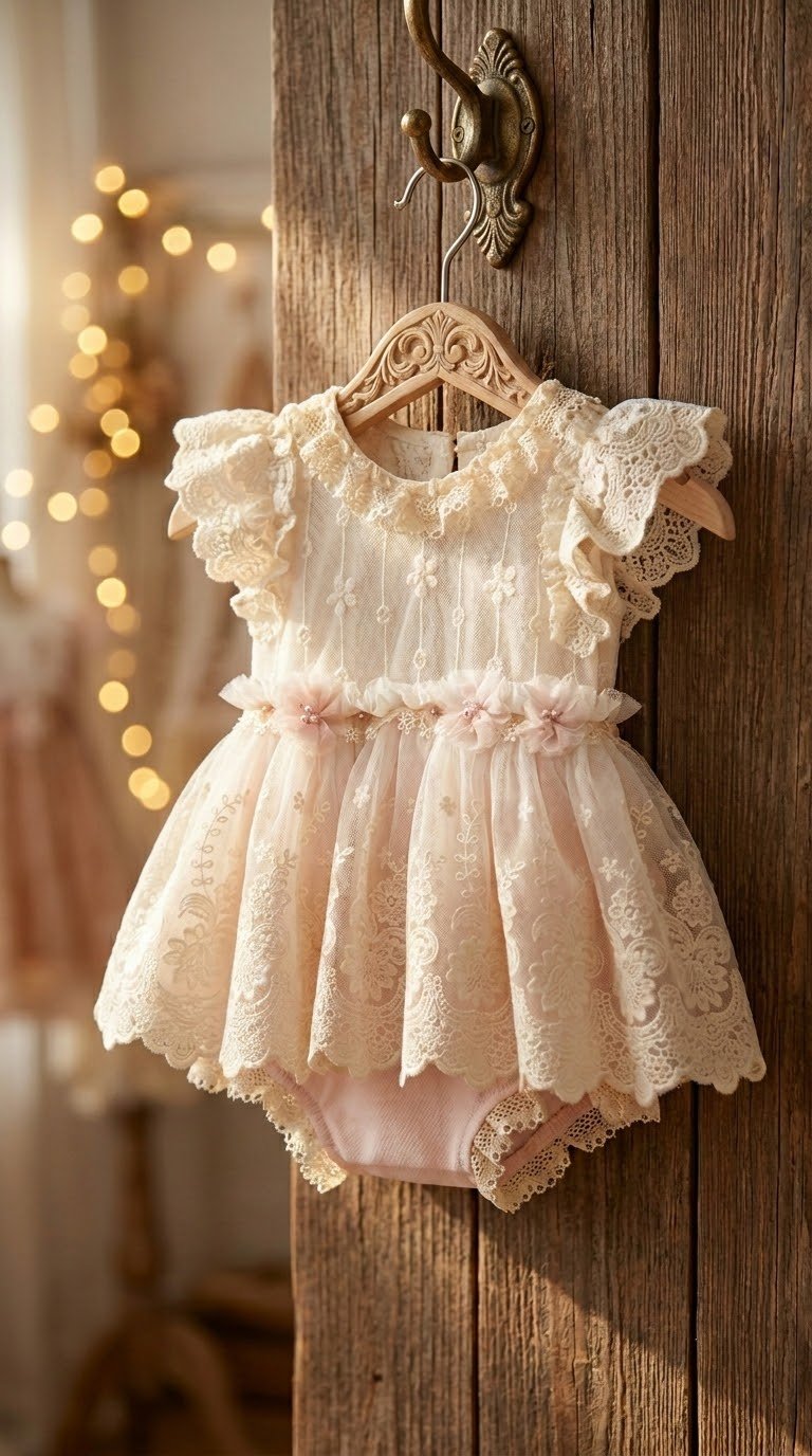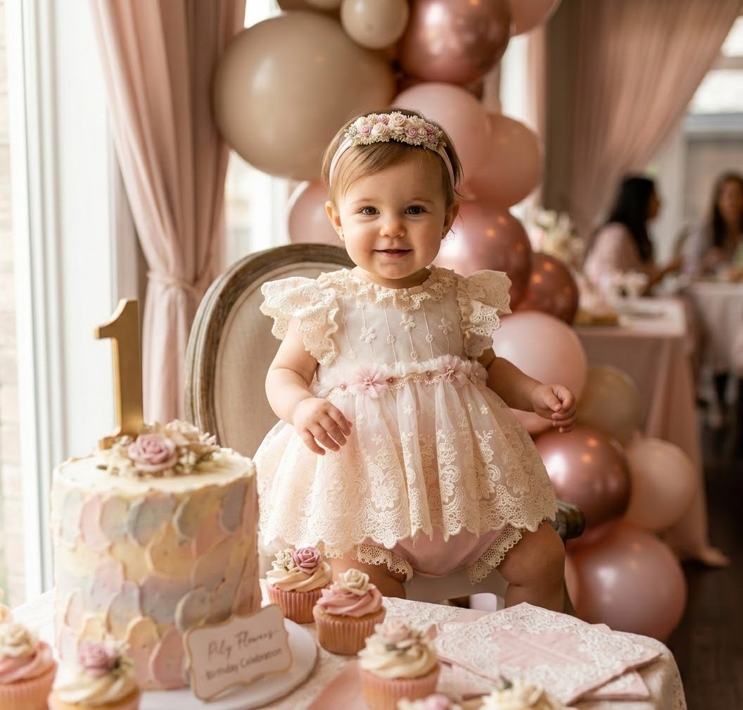 A delicate dream in ivory and rose. The Catalina Romper features exquisite ivory lace layers and a soft pink bottom, handcrafted for your baby's most precious celebrations. Designed with premium, stretch materials to ensure ultimate comfort. This timeless heirloom piece is perfect for a first birthday, blessing, or any special occasion.